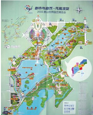 唐山世園會的會址設在唐山市南湖公園,會址總面積19.7平方公里,其中核心區5.4平方公里,體驗區14.3平方公里。核心區總體布局為“一軸八園”。“一軸”為主景觀軸,由北向南依次布局為綜合展示中心、丹鳳朝陽廣場(市民廣場)、駁船碼頭、龍山、熱帶植物園等11處主要景觀節點;“八園”為國內園、國際園、設計師園、低碳生活園、少年世博園、生態科教園和專類植物園等。