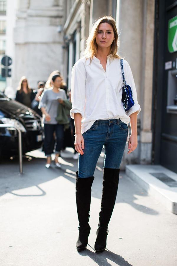{Look 1、白色衬衫与牛仔裤} 带些OL气息的白色衬衫总是容易被大家忽视,看上去过于“正经”,所以经常都有所避开它,可是白衬衫才是衣橱必备的单品,因为它基本搭什么都好看,而且精神又利落,配牛仔裤也是一绝!