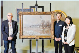 左起为策展人 Bruno Girveau、法国5月艺术节行政总裁贾奕楠与香港文化博物馆总馆长卢秀丽主持莫奈展品开箱仪式,图为是次展览展品之一《维特尼流域塞纳河解冻,面向拉瓦古》。