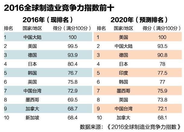 德勤曾在2010年和2013年两次发布《全球制造业竞争力指数》,中国两次均排名第一。不过,该报告预测,未来五年中国的竞争力将有所下降,到2020年排名将下滑至第二位。美国将超越中国成为全球制造业最具竞争力国家,德国仍将占据第三的位置。
