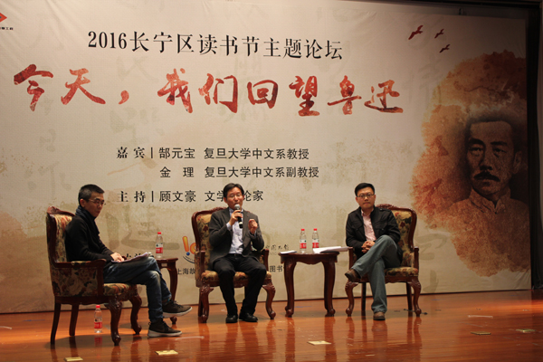 4月23日,2016上海长宁区读书节开幕论坛上,顾文豪(左)、郜元宝(中)、金理(右)引领读者回望鲁迅。