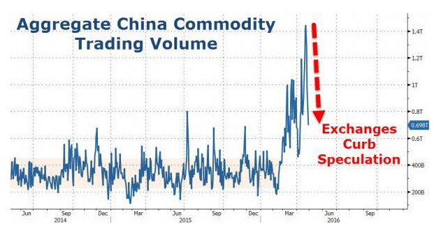 據彭博報道,在中國大宗商品市場上周單日交易額創下1.7萬億元人民幣的高位后,隨著監管機構加大控制力度,投機資金開始撤離這一市場。周三,大商所、上期所和鄭商所全天各期貨合約成交額下降至1萬億元人民幣,已較峰值萎縮約40%。