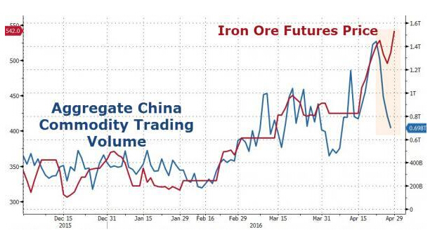 鐵礦石期貨價格與商品期貨交易量走勢: