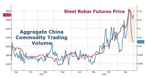 螺紋鋼貨價格與商品期貨交易量走勢: