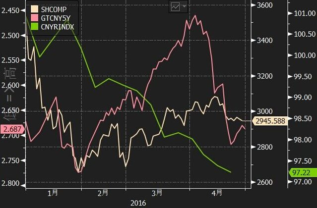 5五年期國債收益率(紅線),上證指數(黃線),CFETS指數(綠線)