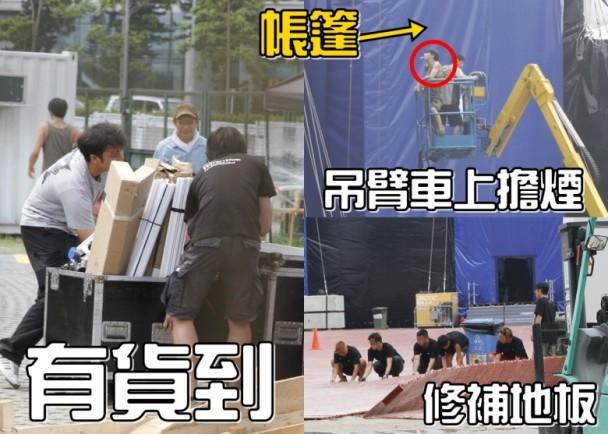 同时间,有工作人员从吊臂车升到场馆帐篷顶部,拿着疑似是透明胶纸的东西在修补帐篷,不过其中一人口上拿着香烟,升上布料不符合消防防火要求的帐篷上工作,似乎不太安全。另外,亦有工作人员正在修补地板。