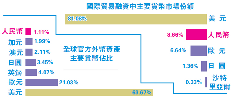 當今全球80%的貿易結算采用基礎貨幣美元,相對於中國的國際貿易量,人民幣在國際上的份額還很低。中國還保留著固定的匯率管理制度和嚴格的交易限制,盡管海外企業也非常期待人民幣市場擴大,但大幅增加在結算等方面的應用還有很大難度。據日本媒體報道,就連大力強化中國業務的日立制作所,也是因為2012年開始的日圓與人民幣直接交易市場使用不方便,而仍然以美元結算為主。