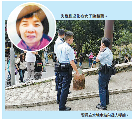 【香港商报网讯】记者冯仁乐报道:城门水塘行山失踪脑退化症妇人,失踪达两日仍未寻回,政府多个部门联手动员80人,昨日继续展开搜寻,范围由荃湾区一带扩大至大埔区,虽然搜索面积扩大,由於失踪妇并无手机可作联络,至今日凌晨仍未有结果;事主的七旬母亲心急如焚,亲自到屋商场派传单给居民,希望早日寻回爱女。