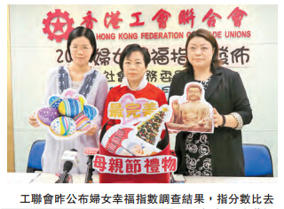 【香港商报网讯】记者王珈莉报道:下周日(8/5)是母亲节,工联会社会事务委员会於节日前夕公布妇女幸福指数,发现平均幸福指数由去年的7.26分下降至6.97分,下跌0.29分;觉得幸福的妇女亦由去年的83.3%,下跌至81.4%,反之觉得不幸福的妇女有18.6%,较去年上升1.9%。工联会立法会议员麦美娟表示,不少女性不能受惠於强积金,担心晚年退休无保障,促请政府完善退休保障及划一劳工假期和公众假期。