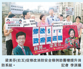 经民联立法会议员梁美芬建议修改消防安全(建筑物)条例第572章,赋予消防处酌情权,因应安全及紧急考虑协助旧楼提升消防系统,事後才收取相关费用的权力,又指其建议已取得律政司回覆,但仍在等政府审核後提交上立法会。梁美芬形容,有关问题刻不容缓,政府不应再三拖延,而是应双管齐下改善有关问题。