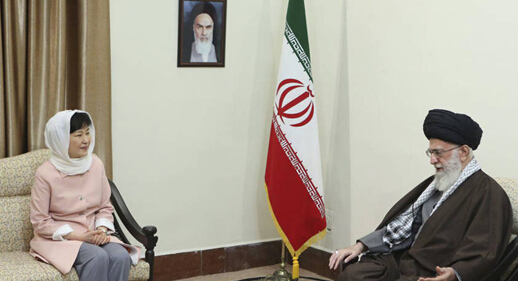 5月2日,正在伊朗访问的韩国总统朴槿惠(左)同伊朗最高领袖哈梅内伊举行会晤。