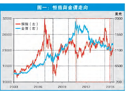 黃金可避險,那股市向好時金價應下跌,反之亦然。不過,圖一見到,由2003年港股低位抽升至今,并不是每個時期都是一升一跌,最經典就是2003至2007年全球大牛市間,股市與金價同升,再到2009年3月金融海嘯后至2011年金價亦與股市同升。數數手指,同升同跌的時間已占這十多年的一半。如果姨媽姑姐真的相信股市與金價的逆向關系而在大牛市間沽金的話,就「大鑊」了。