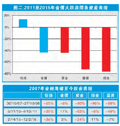 筆者觀察了自2007年大牛市至今股市明顯調整下(跌逾一成以上)的金價與金股表現,第一當然是金融海嘯間,恒指由歷史高位31604點大跌六成五,金價微跌半成左右,但一眾金股跌逾九成。另外在去年中恒指於大時代見頂回落至今年2月低位間,金價受避險資金流入而錄得升幅,紫金及靈寶黃金都是偏軟的,而且還未計及2011年(見表)歐債危機間金股與恒指同跌。金股與金價能避險嗎?大家還是不要亂來。
