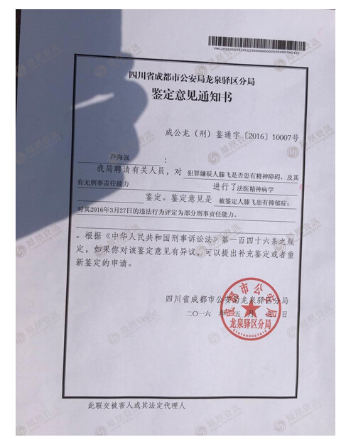 5月4日上午,成都龍泉驛公安分局民警,向四川師范大學殺室友事件被害人家屬,告知了嫌疑人精神鑒定結果。根據警方出具的鑒定意見通知書,嫌疑人滕剛(化名)的法醫精神病學鑒定意見是:患有抑郁 癥;對其3月27日的違法行為評定為部分刑事責任能力。
