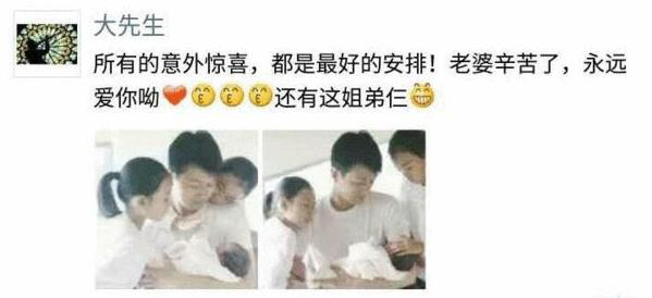 5月4日,佟大为在朋友圈晒出怀抱婴儿的照片,并写道:“所有的意外惊喜,都是最好的安排!老婆辛苦了,永远爱你呦,还有这姐弟仨。”
