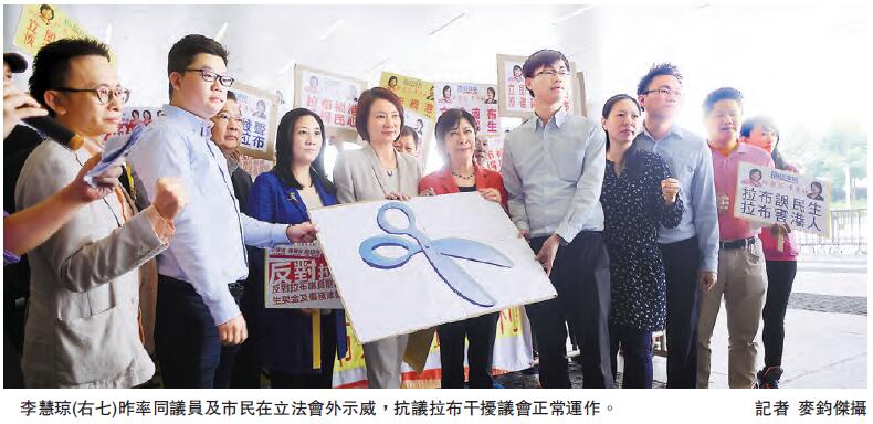 【香港商报网讯】记者周伟立、李淇报道:立法会经历连续两星期出现流会後,昨继续就财政预算案《拨款条例草案》展开辩论。激进反对派议员续肆意拉布,全日多次提出点算人数,遭到多名建制派议员炮轰。民建联立法会议员李慧琼及蒋丽芸等连同约30名市民在立法会外示威,抗议议员拉布干扰议会正常运作,拖延通过惠民措施,损害市民利益,更令香港有机会堕入财政悬崖。
