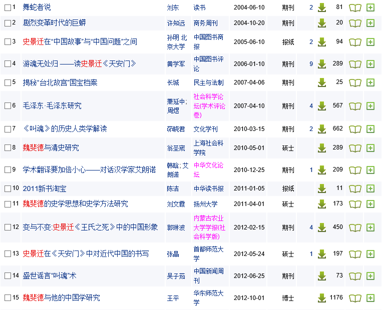 其后,顾思齐在2005年5月23日的《南方都市报》上发表《本土视野的美国“汉学三杰”》(以下简称顾文),使这一提法更多地进入了大家的视野。同一年,戴轶尘的《文化认同问题:史景迁视野中的清朝文字狱》(《社会观察》第9期)提到“汉学三杰”:“史景迁是当代美国的‘汉学三杰’之一,素以下笔如挥闻名,著作等身。”其中“下笔如挥”四个字,顾思齐文中也有。但戴文没有说明其他“两杰”是谁。2006年5月5日,刘东在伯克利加州大学演讲,题目是《北大课堂上的魏斐德》,其中谈到美国汉学界的“清史三杰”,也引用了顾思齐的文章(《中国学术》总第二十四辑,商务印书馆2007年出版)。2007年,马金生发表《试论史景迁的著史风格》(《史学理论研究》第4期),在文章注释中提到了顾文。2013年,王平的博士论文《魏斐德与他的中国学研究》(华东师范大学)提到“三杰”时给出了注释,即顾文。