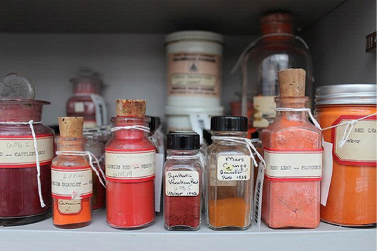 斯特劳斯中心颜料收藏中的一瓶瓶颜料。图片来源:Antoinette Hocbo, President and Fellows of Harvard College