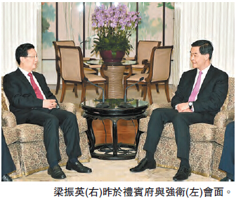 【香港商報网訊】記者馮仁樂報道:行政長官梁振英(CY)昨日傍晚在禮賓府與江西省委書記強衛會面,就雙方共同關心的課題交換意見。
