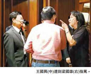 他在展示反对「拉布」的横额时,「拉布」议员梁国雄(长毛)从会议厅走出来,双方发生争执。期间两人互相指骂对方,王国兴批评梁国雄霸占公屋,没为人民利益想,更揶揄他是「假哲古华拉」;梁被击中要害反指摘王胡乱说话,更对他挥拳相向。王国兴事後表示,过程中被梁国雄用手拍及胸膛,发出声响,但自己并无受伤,又认为整个过程已被传媒拍摄下,公道自在人心,不会报警。长毛就辩称对方用前臂挡他,并无袭击。