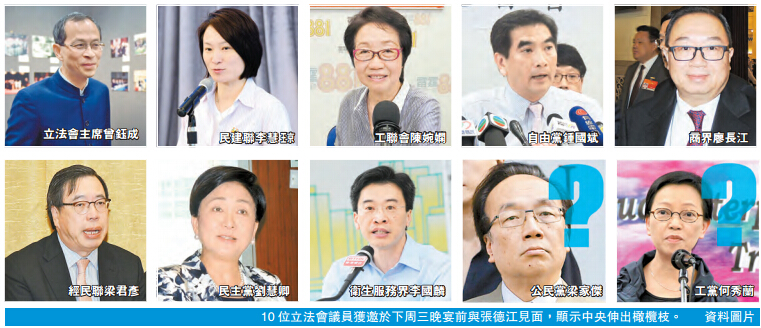 全国人大常委会委员长张德江访港在即,特区政府除了特地邀请全体立法会议员出席为委员长而设的欢迎晚宴外,更有10名立法会议员获邀於晚宴前以酒会形式与张德江见面,历时约40分钟。