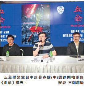 【香港商报网讯】记者王珈莉报道:早前一套讲述香港未来社会发展的电影,惹起全城热话。正义联盟党昨日宣布,将於7月开拍电影《血伞》,描述占领行动後,示威者成功推翻现届政府後的情况。正义联盟党副主席蔡克健表示,电影由他亲自编剧和执导,将邀请该党的成员和其他友好组织的成员参与演出,计划投资最少100万元,预计9月完成拍摄和剪接,并安排上映。