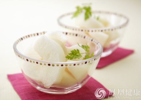 雪梨(供图/华盖) 雪梨 味甘性寒,含苹果酸,柠檬酸,维生素B1、B2,维生素C,胡萝卜素等。有润肺清燥、止咳化痰之功效。成人每天可以吃2个,小孩可以吃1个,如果脾胃虚寒,建议煮着吃更好。 吃法:做道清肺梨; 把雪梨内部掏空,放入川贝、冰糖等上锅煮或蒸熟,待稍冷却后加入蜂蜜。 银耳 味甘、淡,性平,无毒,既有补脾开胃的功效,又有益气清肠、滋阴润肺的作用。能增强人体免疫力,又可增强肿瘤患者对放、化疗的耐受力。此外,银耳富有天然植物性胶质,是良好的润肤食品。 一般食用银耳主要是煲汤,购买时防止买到硫磺熏制作假的银耳。选购试尝时,如有刺激的感觉,证明这种银耳是用硫磺熏制作了假的,切勿购买。 吃法:可做银耳粥,先将银耳泡发,去根切碎,待煮米粥开锅后加入,煮20分钟左右,处于半融化的粘腻状态最好。更可与雪梨同炖成银耳雪梨汤。 百合 百合是多年生草本球根植物,味甘淡,性平,有润肺、养肺、止咳、养血安神的作用。除含有淀粉、蛋白质、钙、磷、铁等营养素外,还含有秋水仙碱等多种生物碱。这些生物碱成分具有养心安神、润肺止咳的功效,对病后虚弱的人非常有益。 吃法;可做成百合银耳粥,注意要选用新鲜百合而非干的,这样的清肺效果最佳。百合30克、银耳20克、粳米50克煮熟后即可食用。 豆浆 将大豆用水泡后磨碎、过滤、煮沸而成。营养非常丰富,不同种类的豆磨成的豆浆还有相应的独特益处。含有丰富的植物蛋白和磷脂,还含有维生素B1、B2和烟酸以及铁、钙等矿物质。除了易吸收外,里头所含的麦氨酸还可防止支气管炎平滑肌痉挛,从而缓解支气管炎,减轻肺的负担。 吃法:一定要在100℃煮沸后再喝,以防止中毒。不要空腹喝,不要装于保温瓶内,不要一次喝过量,也不要与药物同服。 萝卜 萝卜是根茎类蔬菜,含葡萄糖、蔗糖、果糖、维生素C、莱菔甙等,生食熟食都可以。白萝卜中的芥子油、淀粉酶和粗纤维,具有促进消化,增强食欲和止咳化痰的作用。 吃法:可做奶炖萝卜汤。在葱姜加清水后,将稍炸过的萝卜块和牛奶放入同炖,烂后放盐即可,既滋补又清肺。据《钱江晚报》
