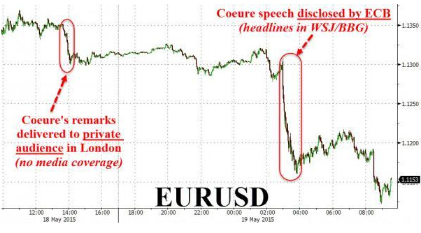 2015年5月18日,Coeure發表了一場閉門演說,向臺下的對沖基金人士透露,因為夏季市場流動性出現季節性短缺,歐洲央行將適度提前啟動量化寬松政策中的資產購買行動。