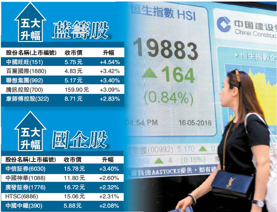 恒指昨早轻微低开8点後迅速倒升,最多反弹279点,续受制20000点关。主要蓝筹股腾讯、控(005)、中移动(941)及友邦(1299)合共推升恒指164点。国指则升11点,收报8312点,主板全日成交按日跌12%至564亿元。