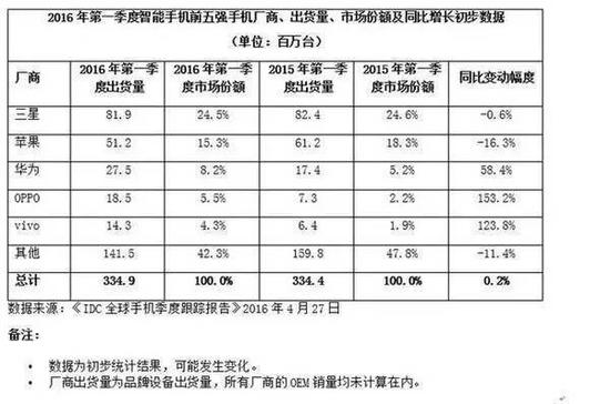 從2016年第一季度智能手機全球銷量排行榜來看,華為手機同比上漲3%,市場份額躍升至8.2%,出貨量同比增長了1000萬台。