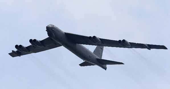 今年2月14日从关岛飞临新加坡的美军B-52战略轰炸机。路透社