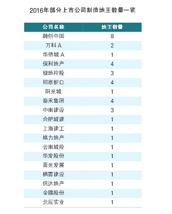 記者整理發現,截至5月15日,包括四大一線城市以及南京等熱點二線城市共計21城,2016年共有110幅土地陸續產生了地王,它們在“高單價、高總價、高溢價率”的“三高”指標中,至少符合其中一條。而細察這些地王背后的資金推手,記者發現,上市房企是最主要的地王制造者,其中不僅有融創這種一貫的激進派,連萬科、綠地、招商等一向以穩健見長的A股龍頭房企,也在今年頻頻制造地王。