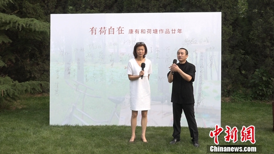 中新网5月23日电 22日,“有荷自在”康有和荷塘作品二十年系列画展在北京举行,艺术家马可鲁、翁伟、布日固德等人到场助阵。画展展出了康有和的近五十幅新作及数幅往日的创作精品,呈现了康有和对荷花、荷塘题材的关注,以及对不同材料及媒介的新探索。值得一提的是,当天的画展是在荷塘生态园中举办,活动期间,作曲家袁中平与油画家赵英分别以古琴与昆曲进行助兴。