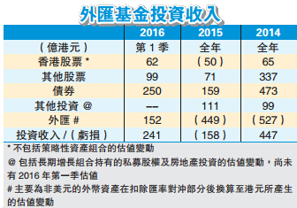 昨日公布的最新数据显示,外汇基金今年首季盈利241亿港元,为近两年来表现最好的一季。报告显示,首季未经审计的投资收益累计有241亿港元,较去年第四季度增加31亿港元,按年大增1.9倍;以实质金额计算,是2014年第二季度以来表现最好的一个季度,期间受惠於投资巿场避险情绪升温,带动债券价格上升,外汇基金的债券投资收益按季转盈250亿港元;另外,受美元汇价疲弱影响,外汇投资方面按季由亏转盈,赚152亿港元;不过,由於期内全球股巿大幅波动,外汇基金手持的香港股票组合於今年一季度再次亏损,单季蒸发62亿港元,其他股票亏损更将近100亿港元。
