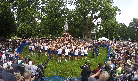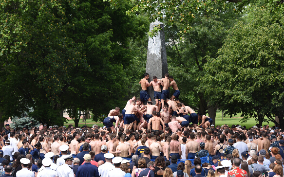 当日,美国海军学院约1000名一年级学生参加攀爬赫恩登纪念碑活动。学生们在活动中协力攀爬一座涂满油脂的6.4米高的方尖碑(赫恩登纪念碑),将放在碑顶的新生戴的水手帽换成军官帽。该活动象征一年级结束,学生们从“水手”成长为海军“军官”。美国海军学院于1845年成立,是世界着名军校之一,学制4年,主要为美国海军舰艇、海军航空兵和海军陆战队培养专业的初级军官。