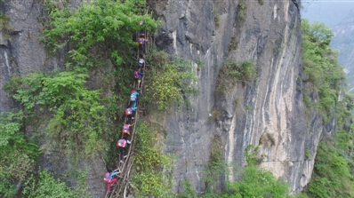 5月14日,15個孩子走崖壁,爬藤梯,大約用了2個小時,到達“懸崖村”。 本版攝影/新京報首席記者 陳杰