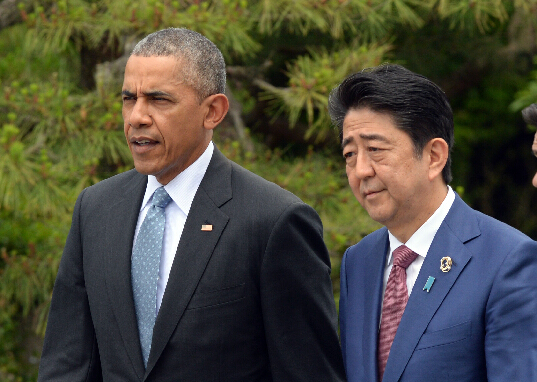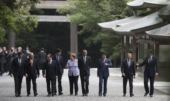 5月26日,在日本三重县,日本首相安倍晋三(右三)、美国总统奥巴马(右四)、法国总统奥朗德(左三)、德国总理默克尔(右五)、英国首相卡梅伦(右一)、意大利总理伦齐(左一)、加拿大总理特鲁多(左四)、欧洲理事会主席图斯克(右二)和欧盟委员会主席容克(左二)参观伊势神宫。