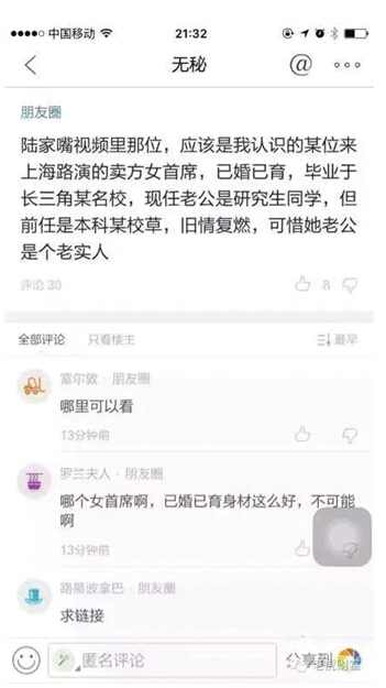新京報記者注意到,在無秘中能看到微信朋友圈和朋友發布的消息,其中大量涉及性等信息,其中還有部分正在用文字的形式分享“陸家嘴不雅視頻”的觀后感。