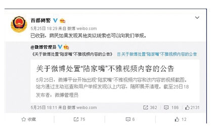 5月25日晚6時許,新浪微博社區管理官方微博發布消息稱,微博平臺于當日開始出現“陸家嘴不雅視頻”內容和該內容的視頻截圖。微博方隨即展開清理。截至25日18時,共處置有關視頻26個、有關圖片內容570條。關閉借此誘導關注,將用戶引導至其他第三方平臺進行傳播交易的賬號5個。