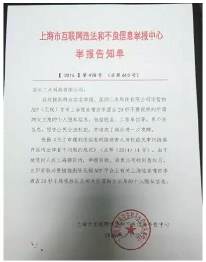 經新京報記者求證證實,5月25日,上海市互聯網違法和不良信息舉報中心曾向“無秘”APP的運營方深圳二木科技有限公司發送《舉報告知單》顯示,稱單位接到實名舉報,“無秘”方面發布與“陸家嘴不雅視頻”所謂女主角相關的個人隱私信息系不實信息,損害公民合法權益,造成輿論進一步發酵。根據相關規定,請二木科技公司收到告知后,立即采取必要措施刪除“無秘”APP平臺上相關個人隱私信息。
