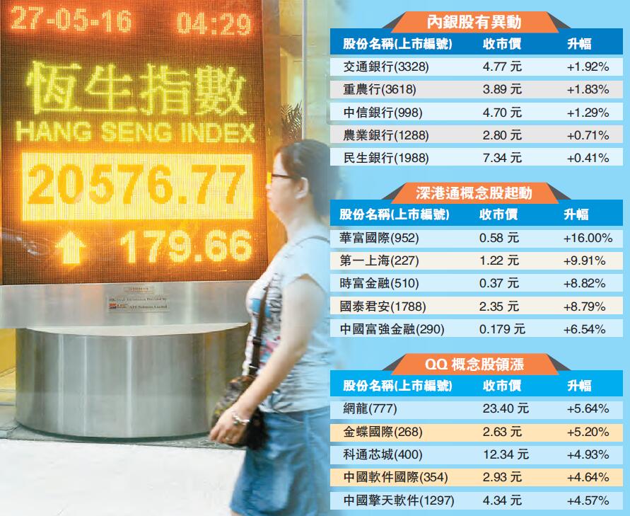 恒指昨早高開28點后表現偏軟,至午后拗腰回升,最多升過223點,收市升179點,報20576點。對於有消息傳「深港通」將於下周宣布并將於7月1日之后開通,港交所(388)發言人表示,目前還未掌握監管機構批準「深港通」的時間表,港交所一直在與內地相關機構保持緊密聯繫和溝通。