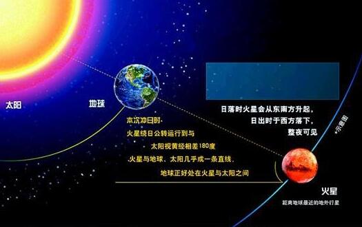 火星是距离地球最近的地外行星。当其绕日公转运行到与太阳视黄经相差180度时,即为“冲日”。此时,火星与地球、太阳几乎成一条直线,地球正好处在火星与太阳之间。日落时火星会从东南方升起,日出时于西方落下,整夜可见。冲日前后是观测火星的较佳时机。
