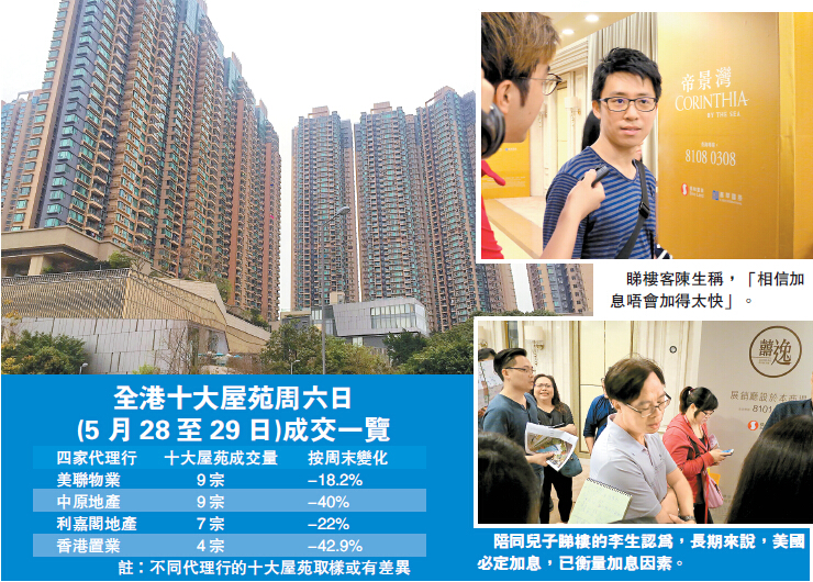 據美聯物業及中原地產數據指,十大屋苑成交量皆為9宗,齊齊失守上周雙位數水平,分別按周跌18.2%及4成。利嘉閣地產及香港置業上周則分別錄7宗及4宗,按周減少22%及42.9%。對於十大屋苑二手成交再次減少,地產代理歸咎主要是受到美國加息預期影響,減低入市意欲,以及一手以低價搶走購買力。