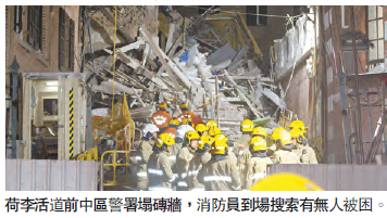 昨晚10時許,舊中區警署一幅8米乘10米磚牆突然倒塌,大批市民報案,警方接報大為緊張,消防派出多部消防車趕至,多名身穿橙色制服的消防處「坍塌搜救專隊」人員到場,協助搜索是否有傷者被困,現場消息指初步無人受傷,相信無人被困。