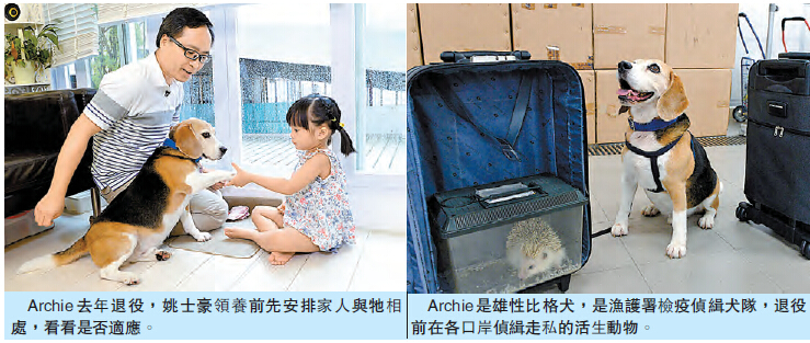 【香港商報網訊】記者周偉立報道:狗隻憑其靈敏的嗅覺,成為人類得力助手。漁農自然護理署(漁護署)於2008年成立檢疫偵緝犬隊,受訓人員和犬隻合作,在各口岸檢測違禁品。其中,「元老級」偵緝犬Archie去年退役,獲領犬員姚士豪收養,融入四口之家,頤養天年。