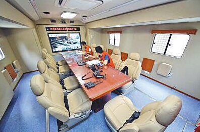 該車整車自重16噸,在車輛內部,有一個近20平方米的會議室,能同時坐下十多人。