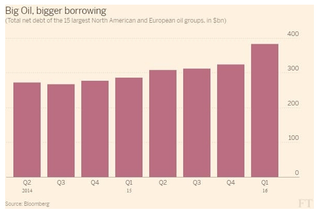 因為過去一年多時間里油價跌勢兇猛,油企們即便不停在削減投資和運營成本,但仍不得不大量舉債來滿足未停工的投資項目和能源股慷慨的分紅。