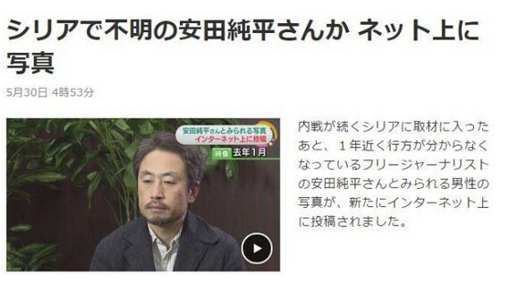 報道稱,安田是東京都鄰縣埼玉縣人,曾在報社當過記者,后來成為自由記者,到過敘利亞、伊拉克等戰亂地區采訪。他去年6月為采訪敘利亞內戰,與當地向導一起自土耳其南部進入敘利亞,從此下落不明。