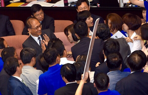 臺灣新任“行政院長”林全上周剛上臺,就將曾經占領政府機構數十天的“太陽花運動”126名成員撤訴。不料,今天林全赴“立法院”進行首次“施政報告”,主席臺就被國民黨“立委”們占領了。