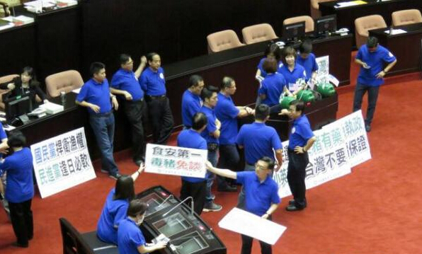 林全入席時,藍委高喊“綠色發夾彎、欺騙全臺灣”、“美豬入臺、林全下臺”。